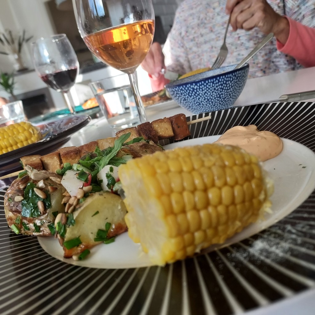 Potatissallad, majskolv, rökt tofu, siracha-sås
