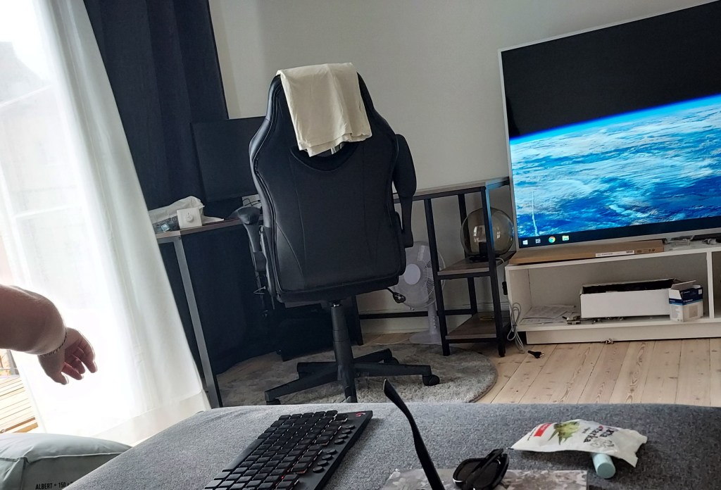 Nu är jag hemma hos Ph och kollar min hans nyrenoverade lägenhet. Nypimpad med en enorm skärm och en skyltdocke-arm. Nej, men det bara blev så.